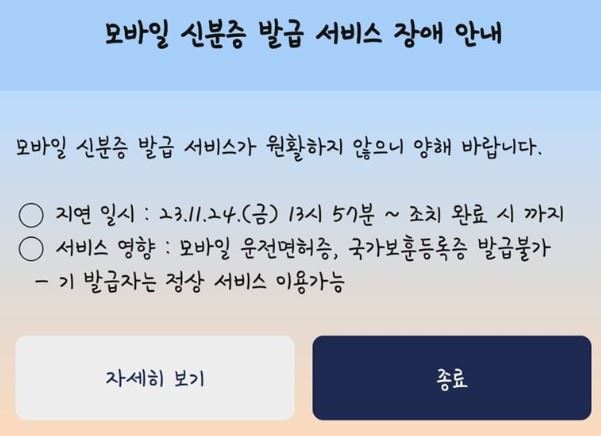 24일 이 서버를 관리하는 한국조폐공사에 따르면, 이날 오후 1시 57분부터 모바일신분증 안내 웹사이트(https://www.mobileid.go.kr/)에 접속하면 접속 오류가 발생했다. 이로 인해 모바일 운전면허증과 국가보훈등록증 신규 발급에 어려움을 겪었다.