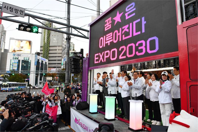 지난 21일 부산 서면교차로 일원서 열린 '2030 부산세계박람회 유치 성공 위한 출정식' D-7 행사 모습. 부산시 제공
