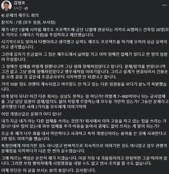 김정호 카카오 CA협의체 경영지원총괄이 28일 페이스북에 올린 최근 사내 임원회의에서 나온 욕설 회의 관련 입장문. 페이스북