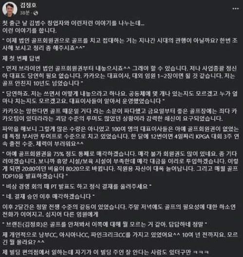 김 총괄은 29일 오전 자신의 페이스북을 통해 지난 9월 말 첫 출근 때 김 창업자와 나눴던 이야기와 카카오그룹에 있는 법인 골프회원권 75%를 매각한 과정을 설명했다.