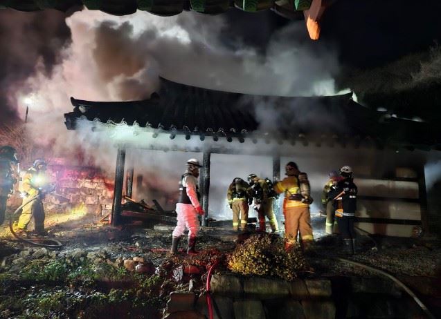 화재가 발생한 경기 안성시에 있는 칠장사 요사채 모습. 소방 대원들이 불을 끄고 있다.