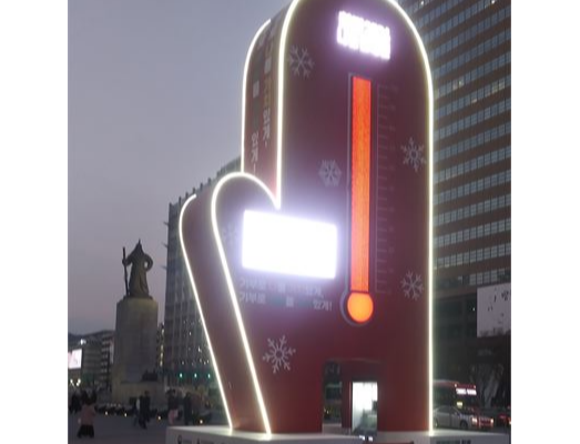 광화문광장 입구 광화문네거리에 설치한 사랑의 온도탑. 사랑의열매 사회복지공동모금회가 모금을 위해 지난달 27일 설치했다. 12월 1일부터 매년 1월 31일까지 62일간 4349억 원을 목표로 하고 있으며 지난해 기부 목표액이던 4040억 원보다 7.7%(309억 원) 많다.