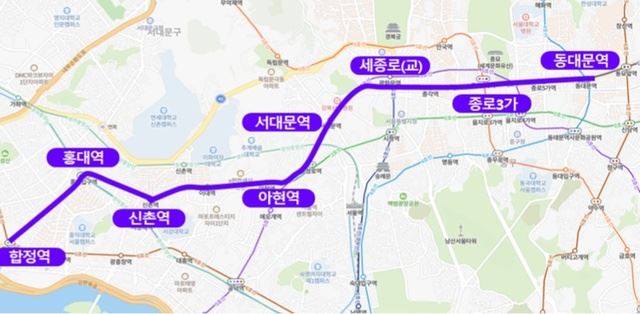 서울시가 4일 밤부터 운행하는 심야 자율주행버스의 합정역~동대문역(9.8km) 노선도. 서울시 제공