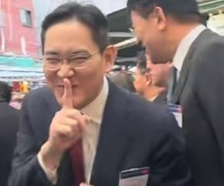 이재용 삼성전자 회장의 사진 한 장이 6일 오후 온라인 커뮤니티에서 화제로 등장했다. 이 사진은 이 회장은 자신을 촬영하는 카메라를 보고 익살스런 모습으로 웃는 모습이다.