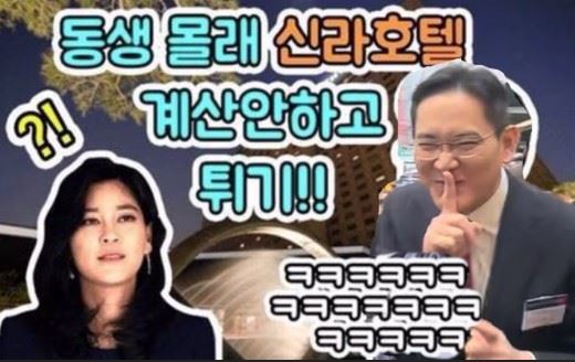 패러디 사진에는 이 회장과 동생 이부진 호텔신라 사장의 사진을 넣고 ‘동생 몰래 계산 안 하고 튀기’라는 글을 적었다.