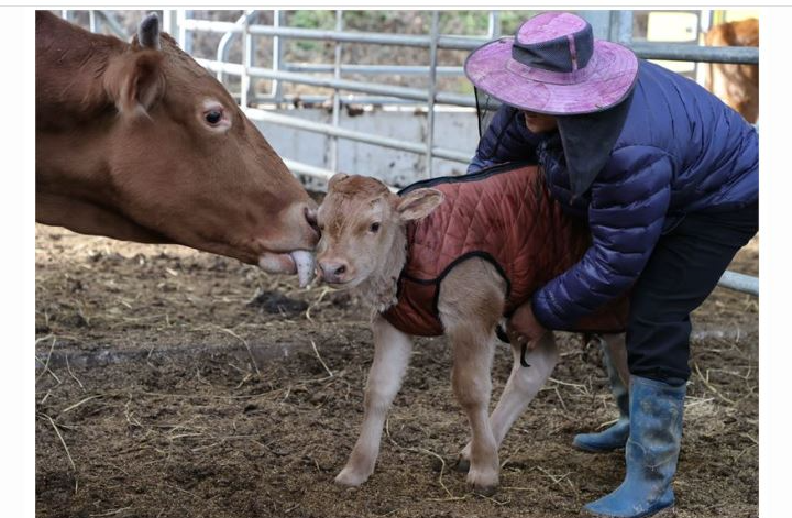한 축산 농가에서 갑자기 날씨 추워지자 송아지에게 보온 겉옷을 입하고 있다. 어미소도 새끼가 추울 새라 볼을 핥아주고 있다. 경남 함양군 제공