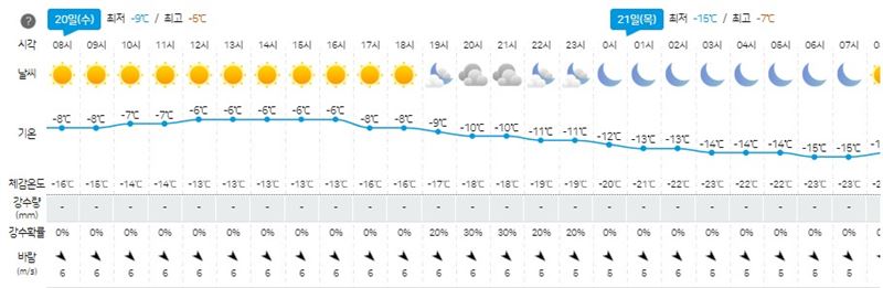 20일부턴 북쪽에 찬 바람이 강하게 내려온다. 21일엔 최저 영하 21도까지 떨어지겠고, 한낮에도 기온이 영하권에 머문다.