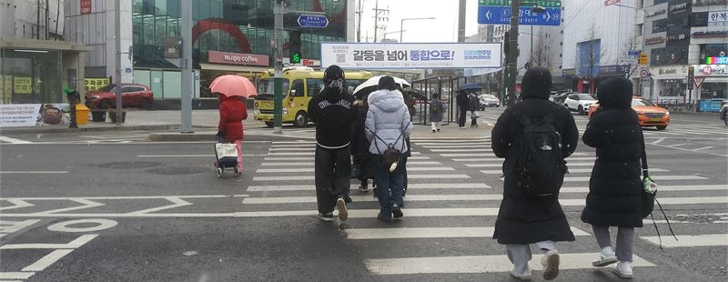 눈발이 날리면서 맹추위가 몰아친 19일 오후 서울 강서구 마곡지구 인근 발산역에서 두둑한 패딩 등으로 무장한 시민들이 횡단보도를 걷고 있다. 정기홍 기자