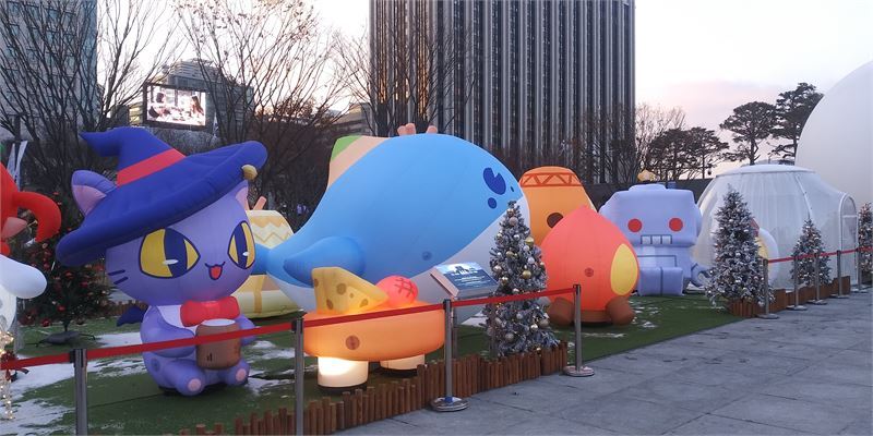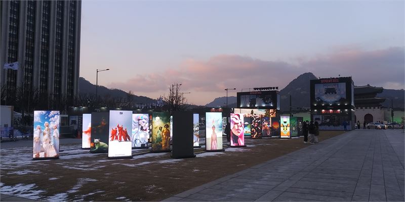 LED 미디어 큐브 작품들. 국내외 디지털 크리에이터 15명이 만들었다. 뒤쪽엔 '2023 서울윈터페스타'를 알리는 대형 입간판 모습