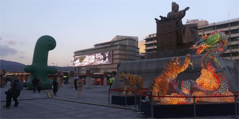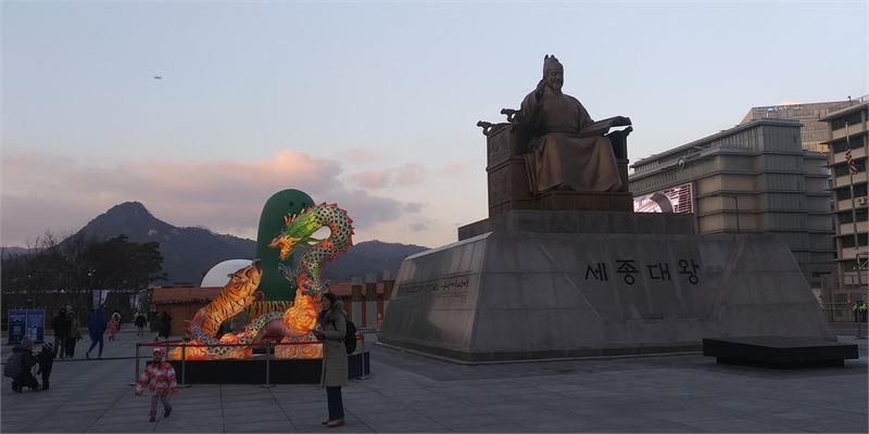내년 '청룡의 해'를 맞아 구름 속에서 깨어나는 청룡을 한지로 형상화한 조형물. 오른쪽은 세종대왕 동상