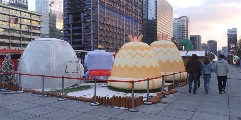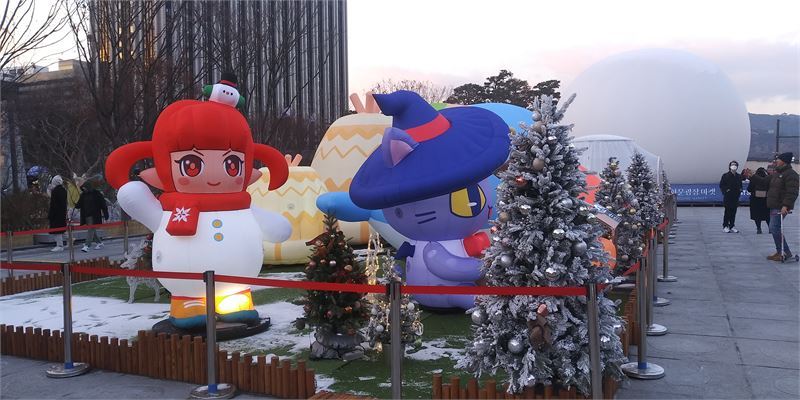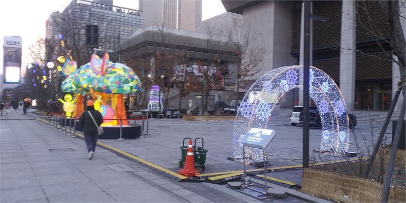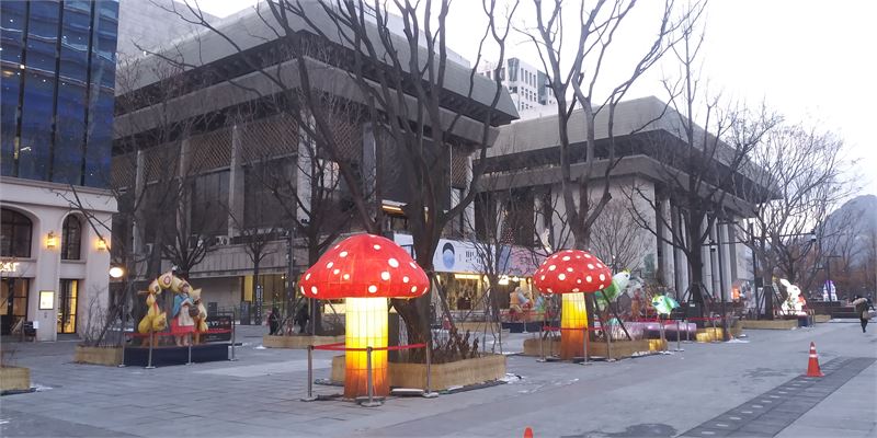 세종문화회관 쪽엔 줄지어 듬성듬성 각종 조형물을 설치해 놓았다. 송이버섯 모양에 불이 막 들어왔다.