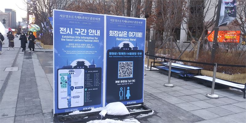 전시 구간과 화장실 안내판. 화장실은 QR코드를 찍으면 쉽게 찾을 수 있다.