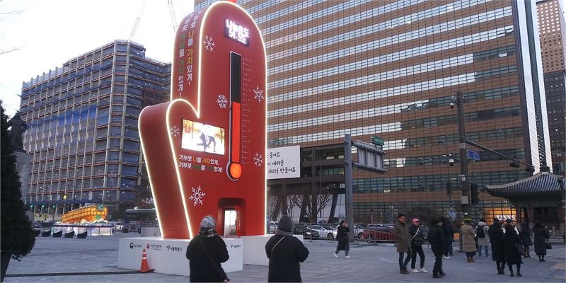 연말연시 사랑의 나눔 온도탑. 연말을 앞두고 있지만 혹한처럼 온도계의 수치는 중간을 약간 웃돌고 있다. 이상 광화문광장서 정기홍 기자