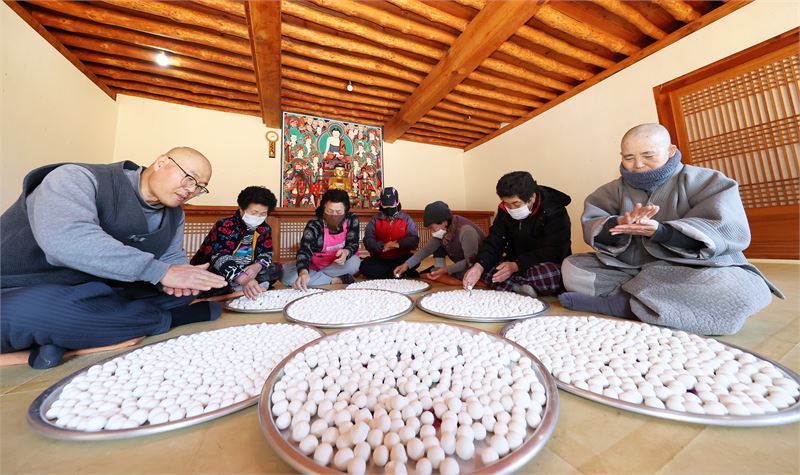 경남 함양군 휴천면 운서리 적조암에서 동지(冬至)를 앞두고 스님과 마을 신도들이 옹기종기 모여 앉아 동지 팥죽에 들어갈 새알을 빚는 모습. 함양군 제공