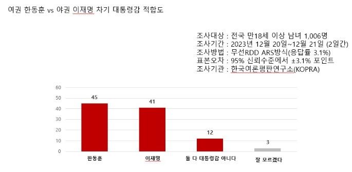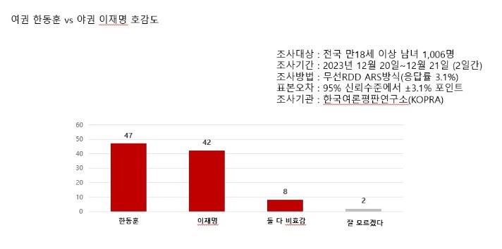 22일 한국여론평판연구소(KOPRA)에 따르면, 20∼21일 만 18세 이상 남녀 1006명을 대상으로 조사한 결과 차기 대통령감 적합도에서 한 전 장관은 45%, 이 대표는 41%였다. 호감도 조사에서는 한 전 장관이 47%, 이 대표은 42%로 나타나 조금 더 벌어졌다.
