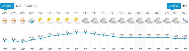앞서 기상청은 23일 중부와 전북에 최대 5cm, 서울과 강원도 1~3cm의 눈이 내려 쌓일 것으로 예보했다. 며칠간 몰아쳤던 북극 한파는 많이 누그려졌다.