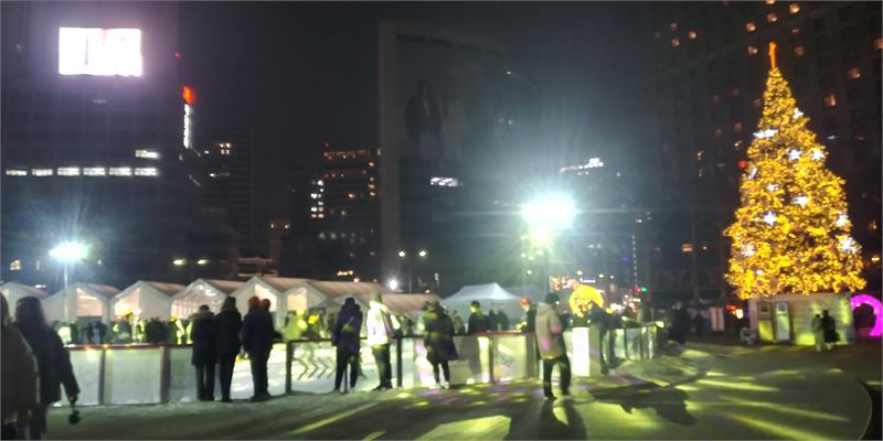 더 플라자호텔과 소공로 쪽으로 본 서울광장 스케이트장. 지나던 시민들이 스케이트장을 구경하고 있다. 크리스마스 트리가 스케이트장 운치를 한결 돋운다.