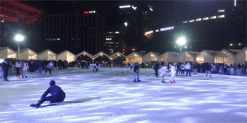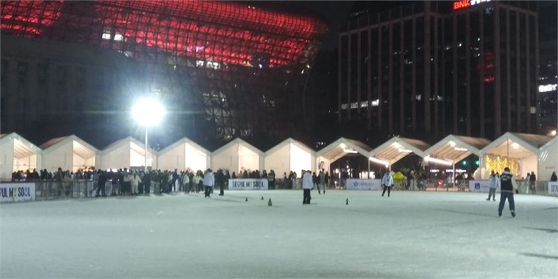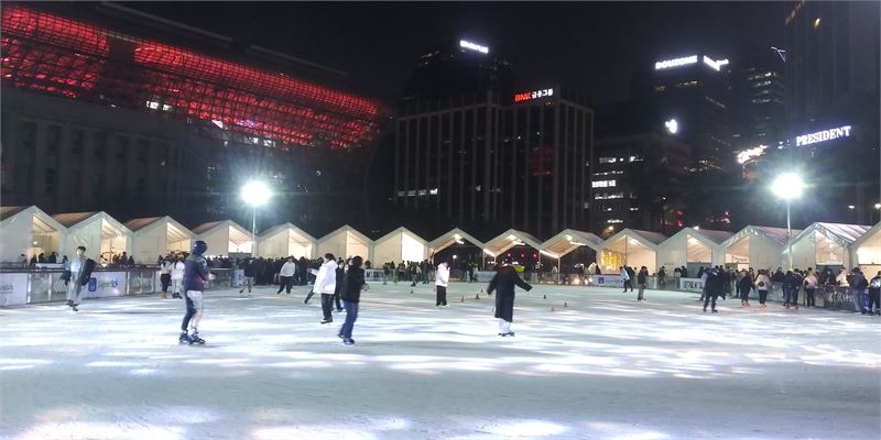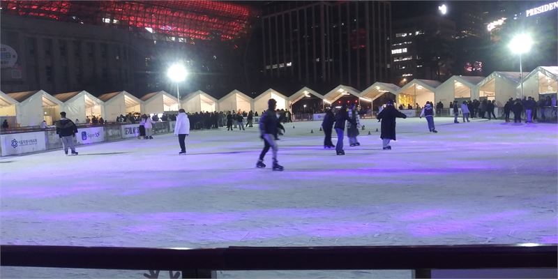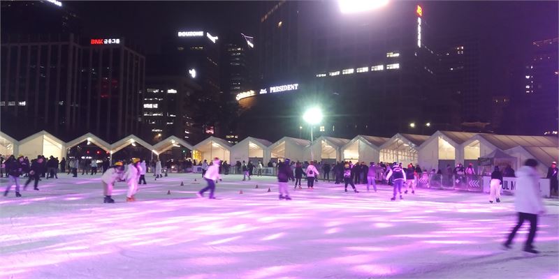 서울광장 스케이트장 모습. 사방에서 야광이 스케이트장을 비춰 한겨울 속의 아늑함이 느껴진다. 스케이트를 타는 시민들도 편안해 보인다.