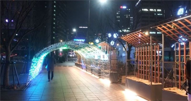 서울광장에 만든 빛 터널을 한 시민이 지나고 있다. 얖쪽은 남대문 쪽이고 뒤는 광화문 쪽이다. 이상 정기홍 기자