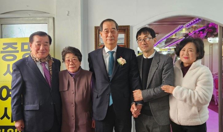 한덕수 국무총리(가운데)가 24일 창원시 마산 신신예식장에서 깜짝 주례를 마친 뒤 고 백낙삼 대표(93세 별세)의 부인 최필순 여사와 아들인 백남문 대표 등 가족과 함께 기념사진을 찍고 있다. 지금은 아들 남문 씨가 유지를 잇고 어머니가 뒤를 돌보고 있다. 한덕수 총리 페이스북