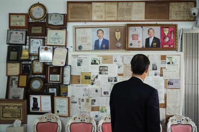 한덕수 국무총리가 24일 경남 창원시 마산합포구 신신예식장을 찾아 고(故) 백낙삼 대표 관련 기념물들을 살펴보고 있다. 국무총리실
