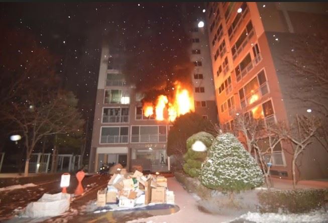 성탄절인 25일 오전 4시 57분쯤 서울 도봉구 방학동의 한 아파트에서 화재가 발생, 불이 활활 타고 있다. 이 불로 2명이 숨졌고 20여 명은 병원으로 실려갔다. 도봉소방서 제공