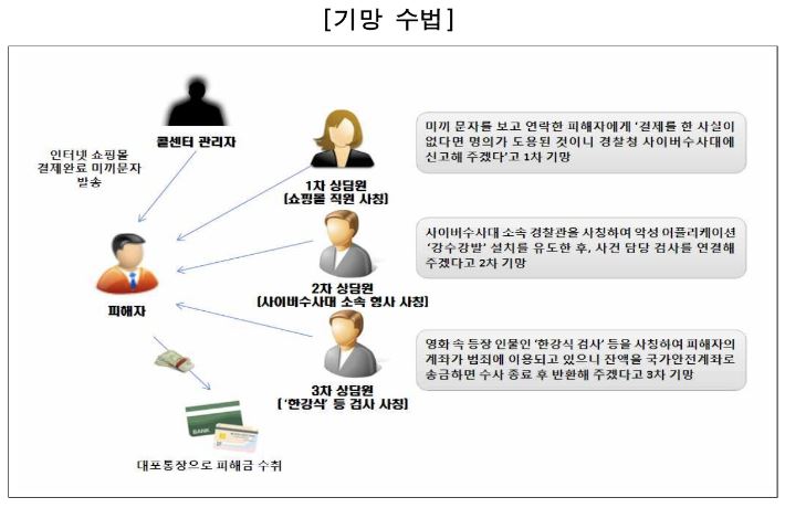 마지막 단계로 수년 전 영화 '더 킹' 속의 인물과 이름이 같은 '한강식 검사' 등 검사를 사칭한 조직원이 피해자에게 "잔액을 국가안전계좌로 송금하면 수사를 마치고 반환하겠다"고 속여 돈을 뜯어냈다.