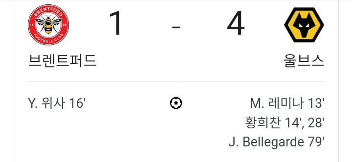 황희찬의 멀티골로 울버햄프턴은 4대 1 완승했다. 이로써 울버햄프턴은 7승 4무 8패(승점 25점)로 리그 11위로 올랐다. 5승 4무 9패의 브렌트퍼드는 승점 19로 14위에 머물렀다.