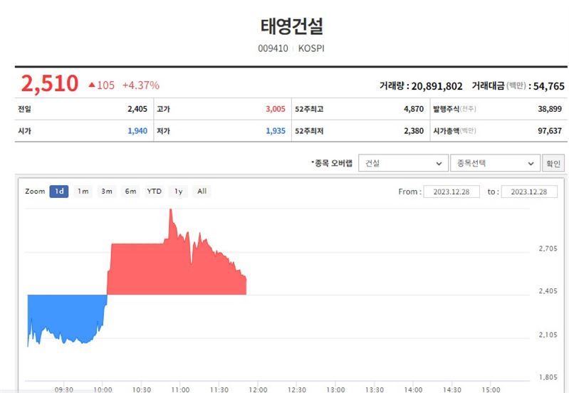 태영건설이 28일 오전 워크아웃(기업구조개선작업) 돌입 소식에 주가가 장 초반 급락하다가 급등한 이후 지속 내림세를 보이고 있다. 주가 변동성이 매우 컸다.