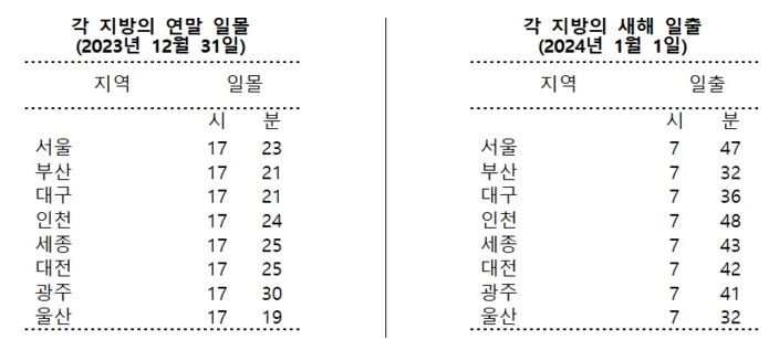 올해 마지막 일물과 내년 첫 일출 시각. 한국천문연구원