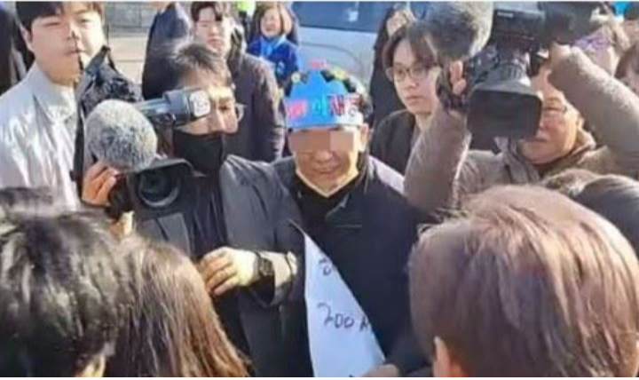 2일 오전 부산 가덕도에서 중년 남성(파란 종이왕관을 쓴 이)이 군중속에서 이재명 민주당 대표를 향해 다가가고 있다. 그는 직후 이 대표의 목을 흉기로 찔렀다. 유튜브 정양일TV 캡처