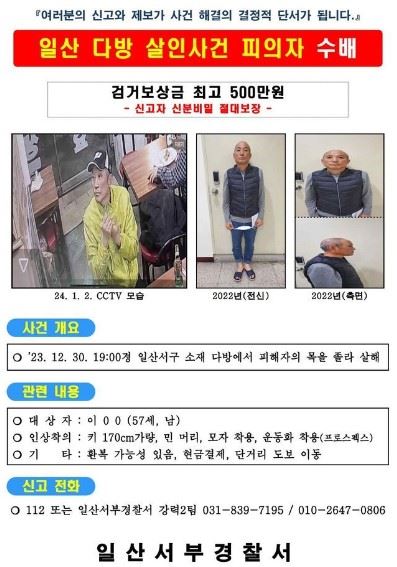경기 북부지역에서 야간에 홀로 다방 영업을 하던 60대 여성 2명을 살해한 용의자 공개수배 전단. 일산서부경찰서