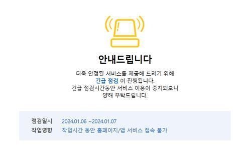 국토교통부는 알뜰교통카드 모바일 앱과 홈페이지에 이날 6일 오전 11시부터 7일까지 이틀간 긴급 점검을 위해 서비스 이용이 중단된다고 안내했다.