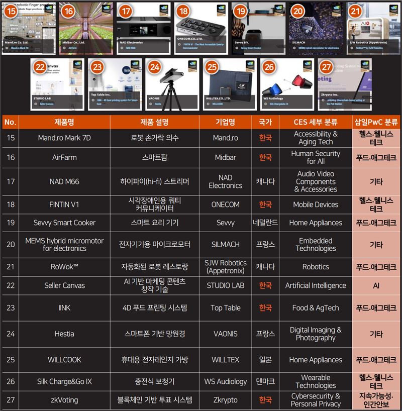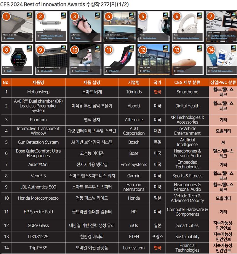 CES2024 27개 최고 혁신상 수상 제품 및 서비스에서 8개가 한국기업 제품이다. 출처: 삼일PwC경영연구원 '미리 보는 CES2024'
