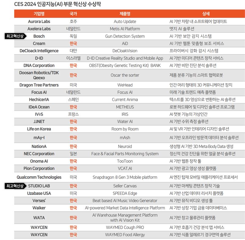 CES2024에서 새로 신설된 AI 부문 28개 혁신상 가운데 16개가 한국기업 제품이다. 출처: 삼일PwC경영연구원 '미리 보는 CES2024'