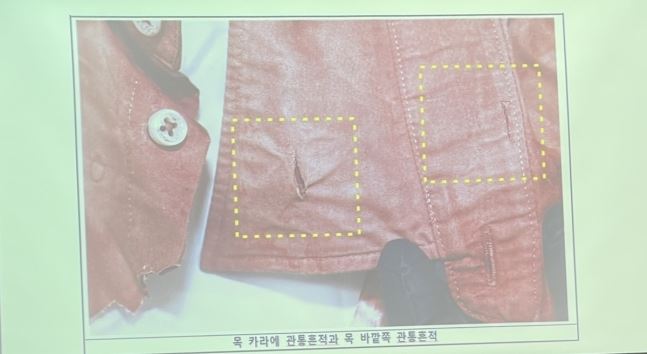 이재명 대표가 피습 당시 입었던 와이셔츠 옷깃에 흉기가 관통한 흔적. 부산경찰청 제공