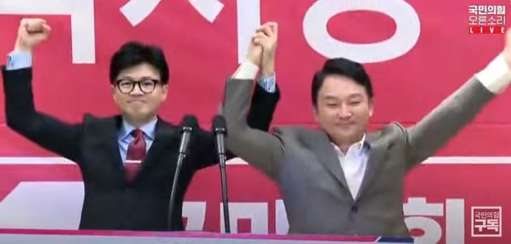 한동훈 국민의힘 비상대책위원장(왼쪽)과 원희룡 전 국토교통부 장관이 국민의힘 인천시당 신년인사회에서 손을 잡고 환호하는 당원들에게 답하고 있다.