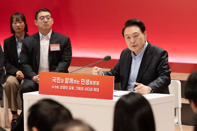 윤석열 대통령이 지난 17일 서울 영등포구 여의동 한국거래소에서 ‘상생의 금융, 기회의 사다리 확대’를 주제로 열린 4번째 국민과 함께하는 민생토론회에서 발언하고 있다. 대통령실 제공