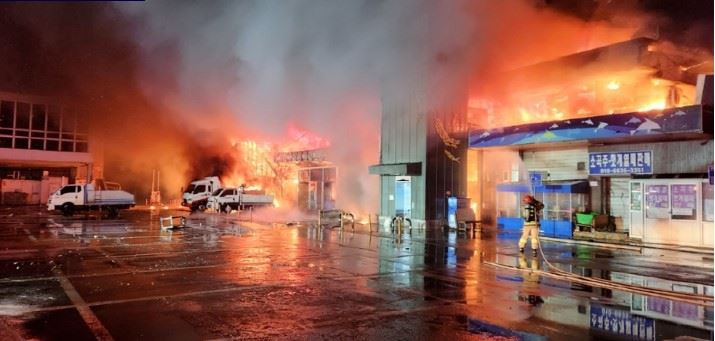 23일 충남소방본부에 따르면 지난 22일 밤 11시 8분쯤 충남 서천군 서천읍 서천수산물특화시장에서 큰 불이 나 292개 점포 가운데 227개가 불에 탔다.