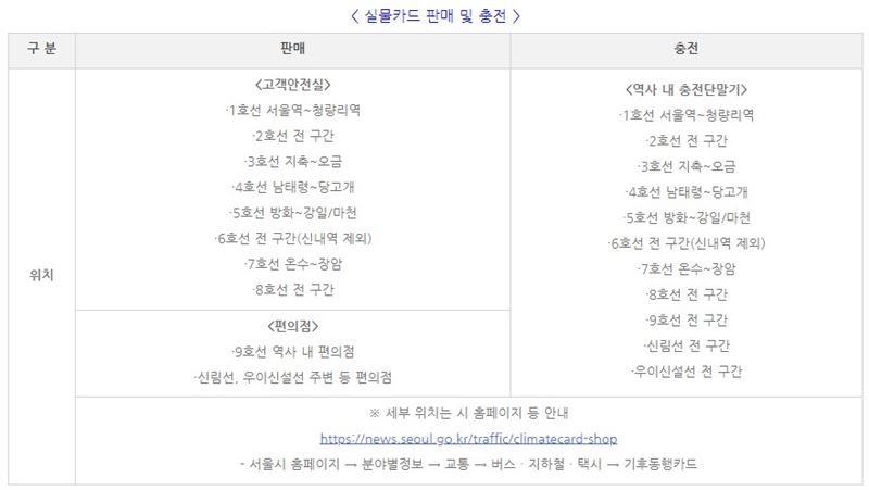 - 서울시 홈페이지(https://www.seoul.go.kr/main/index.jsp)→분야별 정보→교통→버스·지하철·택시→기후동행카드