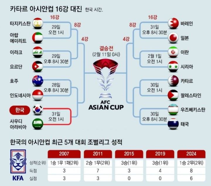 한국은 오는 28일 인도네시아를 4-0으로 물리친 호주와 다음 달 3일 0시 30분 알와크라의 알자눕 스타디움에서 준결승 진출을 다툰다.