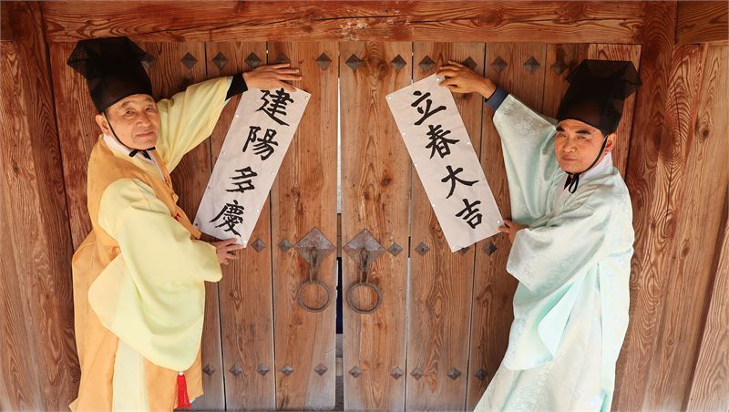경남 함양군 남계서원 원장 등이 입춘첩을 붙이고 있다. 함양군 제공