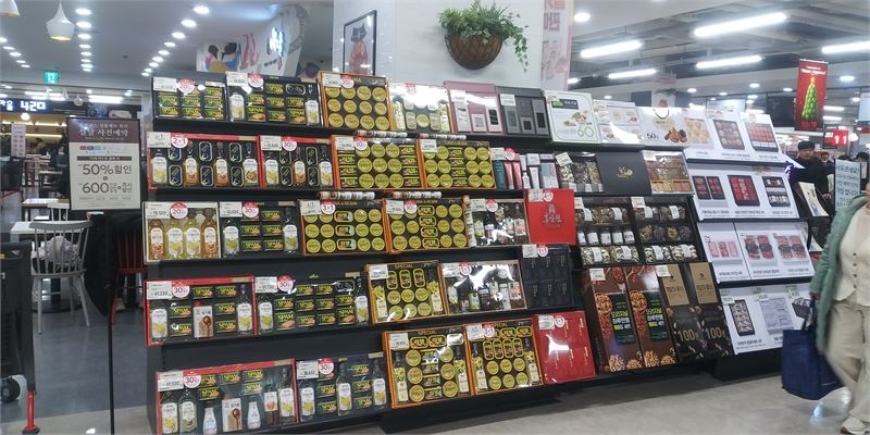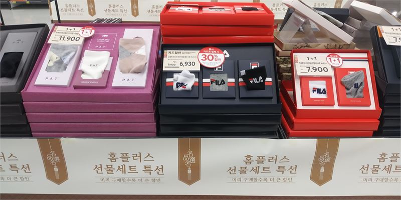 대형마트 입구 설 선물 샘플 진열대 모습. 왼쪽에 참치통조림 선물세트가 다양합니다. 요즘은 선물 내용에 식용유 등을 넣어 다양화해 기호에도 맞추고 있네요. 이상 정기홍 기자