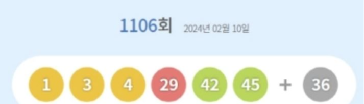 로또복권 운영사인 동행복권은 설날인 10일 제1106회 로또복권 추첨에서 ‘1, 3, 4, 29, 42, 45’가 1등 당첨번호로 뽑혔다고 밝혔다.