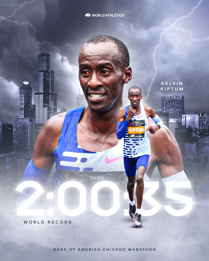 이어 6개월 뒤 열린 미국 시카고마라톤에서는 2시간 00분 35초로 세계 신기록을 세웠다. 앞서 엘리우드 킵초게(40)가 2022년 독일 베를린에서 세운 2시간 1분 9초를 34초 당겼다.