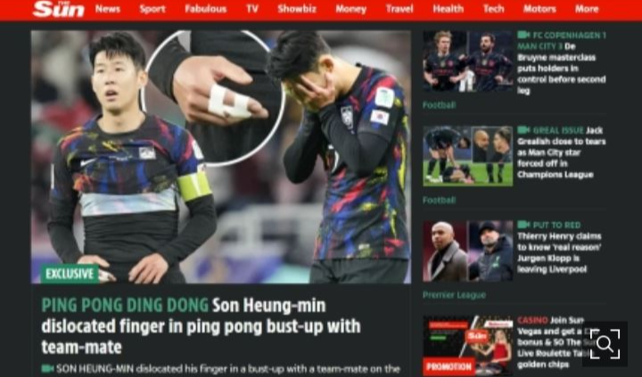 영국의 더 선이 13일(현지 시각) 보도한 토트넘 손흥민의 아시안컵 손가락 부상 관련 단독 기사. 손가락 두개를 테이프로 감았다. 더 선(The Sun)
