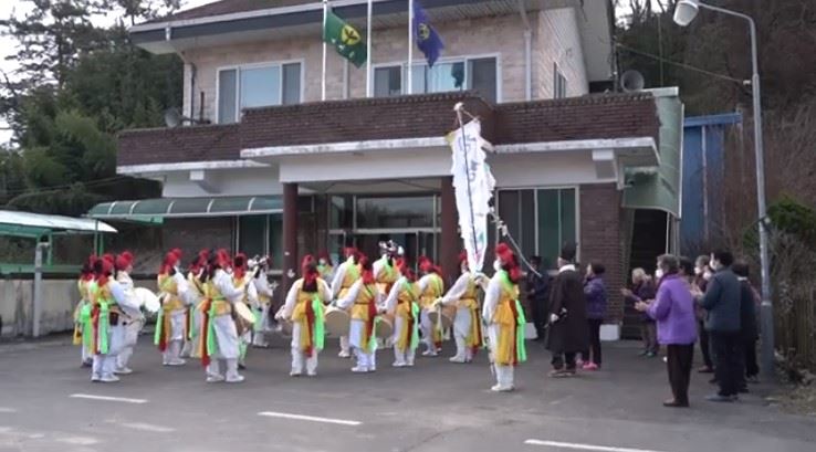 2023년 정월대보름을 앞두고 경남 진주시 진성면 구천마을 회관 앞에서 펼쳐지고 있는 지신밟기 모습. 정창현 기자