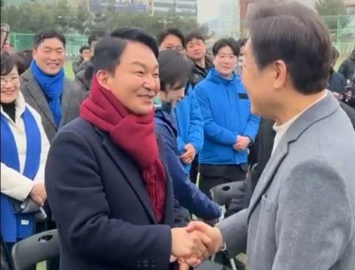 인천 계양을에 국민의힘 후보로 출마한 원희룡 전 국토교통부 장관이 지난 18일 계양구 계산체육공원 축구장에서 열린 계양축구협회 시무식에서 이 지역구 의원인 이재명 민주당 대표를 만나 악수하고 있다. 원희룡 전 장관 페이스북