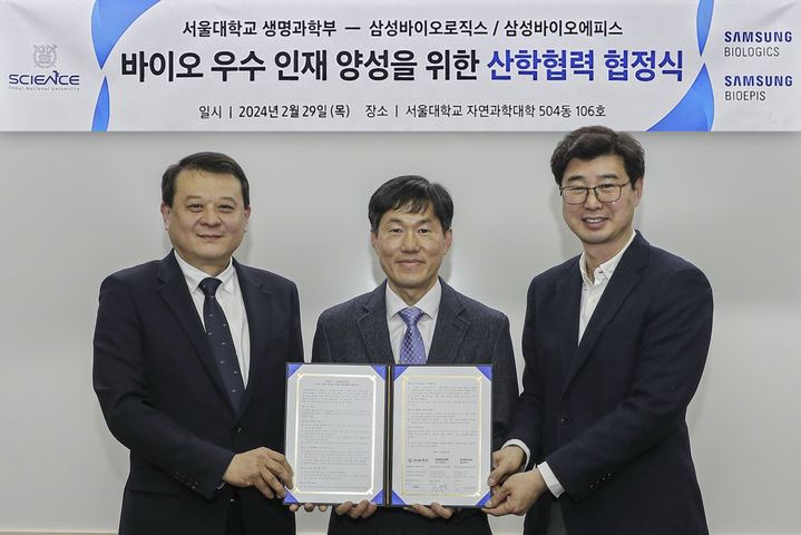 삼성바이오로직스와 서울대가 29일 바이오 우수인재 양성 산학협력 협정을 했다. 이규호 삼성바이오로직스 인사센터장(왼쪽부터), 허원기 서울대 학부장, 노성원 삼성바이오에피스 인사팀장이 기념 촬영을 하고 있다. 삼성바이오로직스