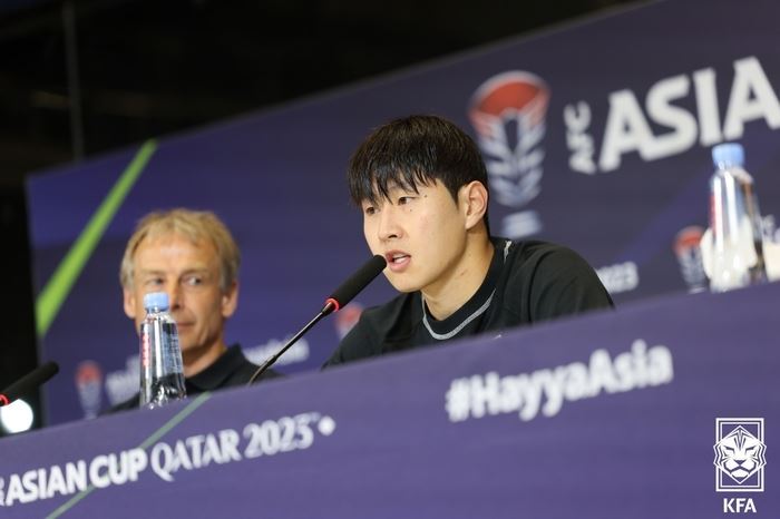 이강인이 아시안컵 4강전인 요르단전에서 0-2로 패한 뒤 클린스만 대표팀 감독이 지켜보는 가운데 기자회견에서 발언을 하고 있다. 대한축구협회